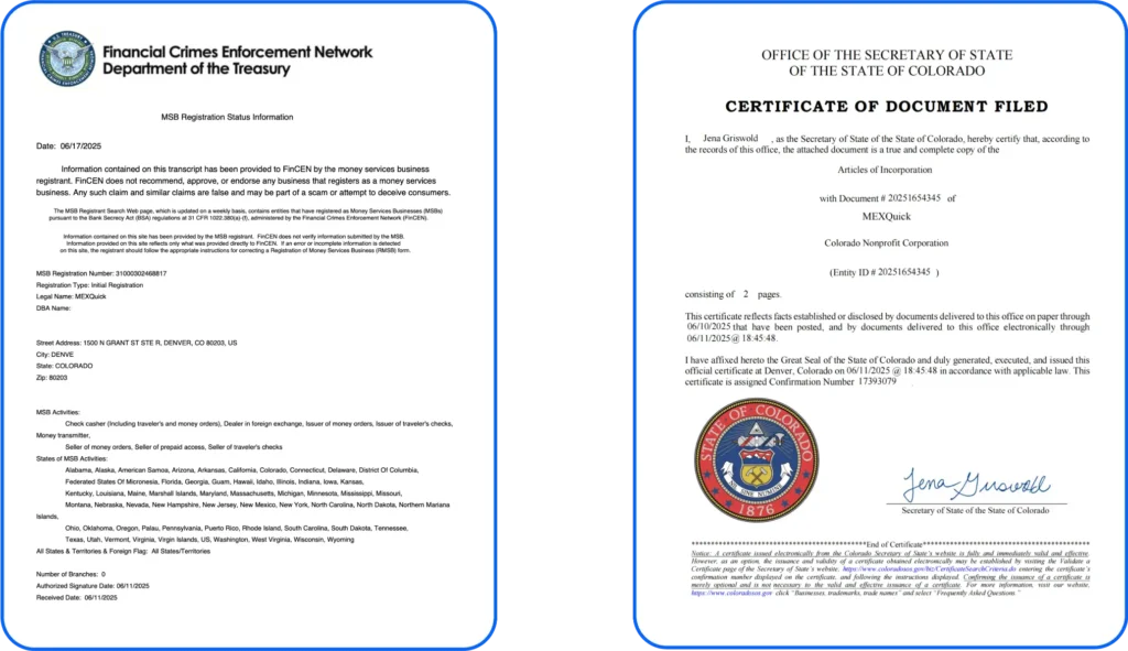 MEXQuick operates with full compliance, proudly holding a license from the US MSB (Money Services Business). Our services adhere to online trading standards, providing you with a secure and trustworthy environment.